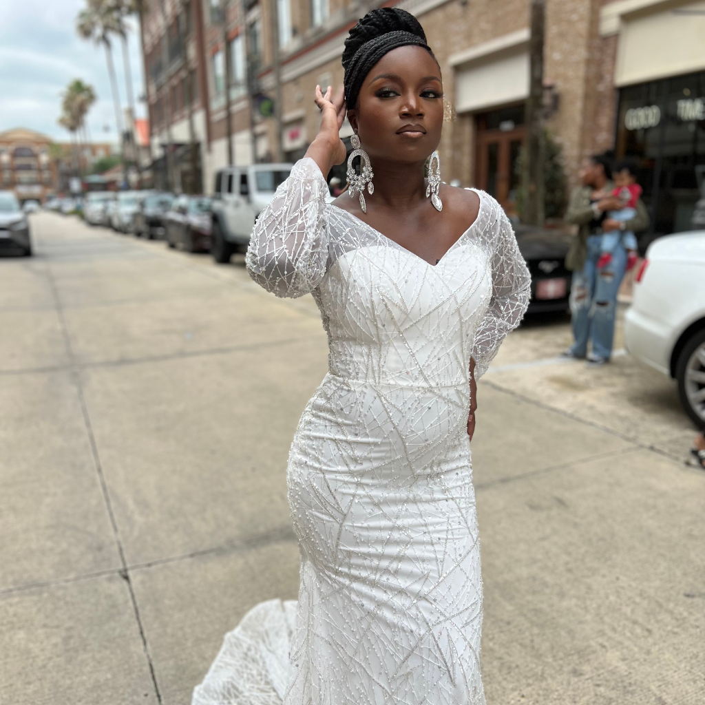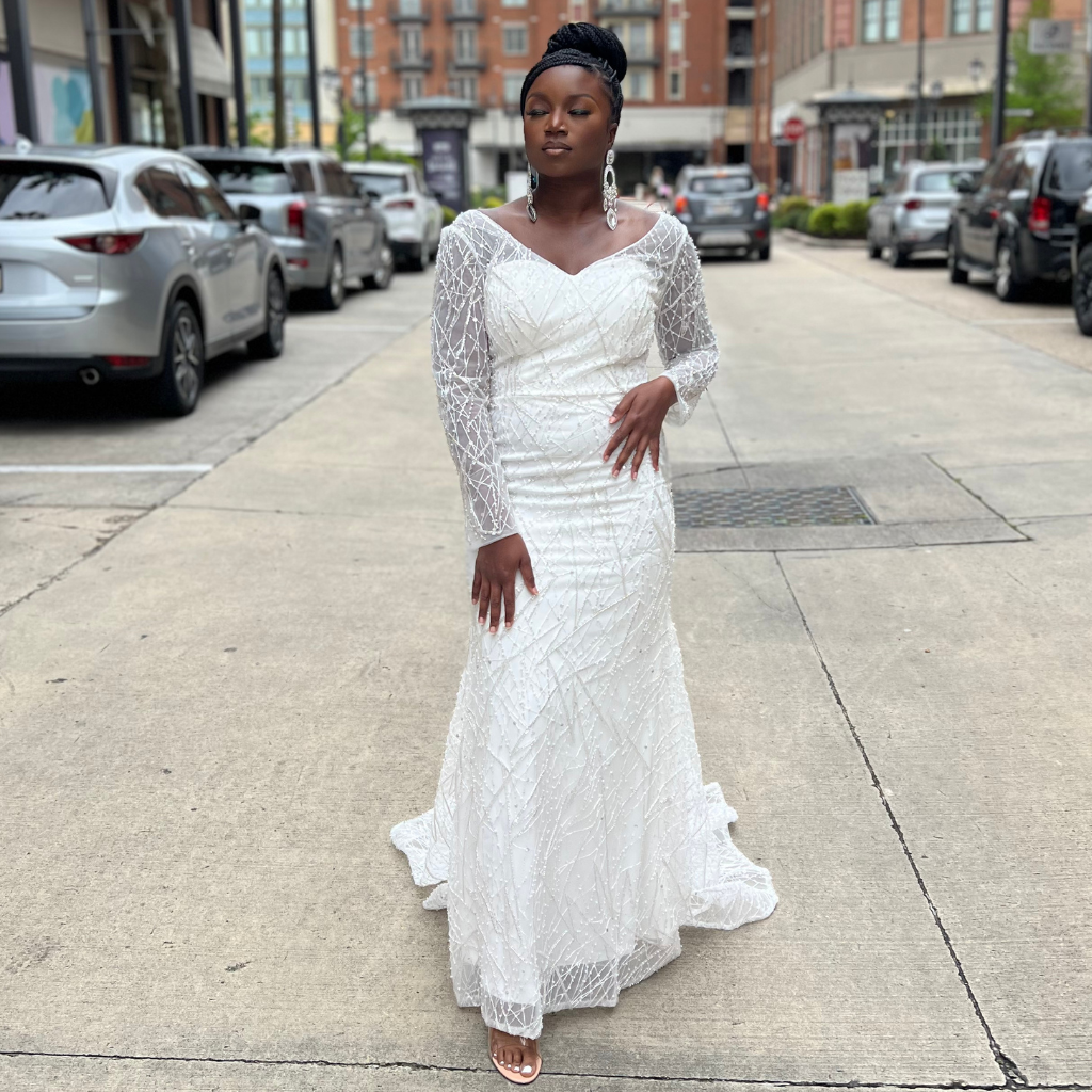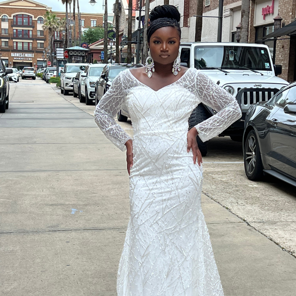 Lace Enchantment is a stunning and elegant gown that features a unique combination of white lace and silver beading. The dress is designed to flatter the figure, with a fitted bodice that accentuates the curves of the body and a flowing skirt that adds a touch of grace and fluidity to the dress.