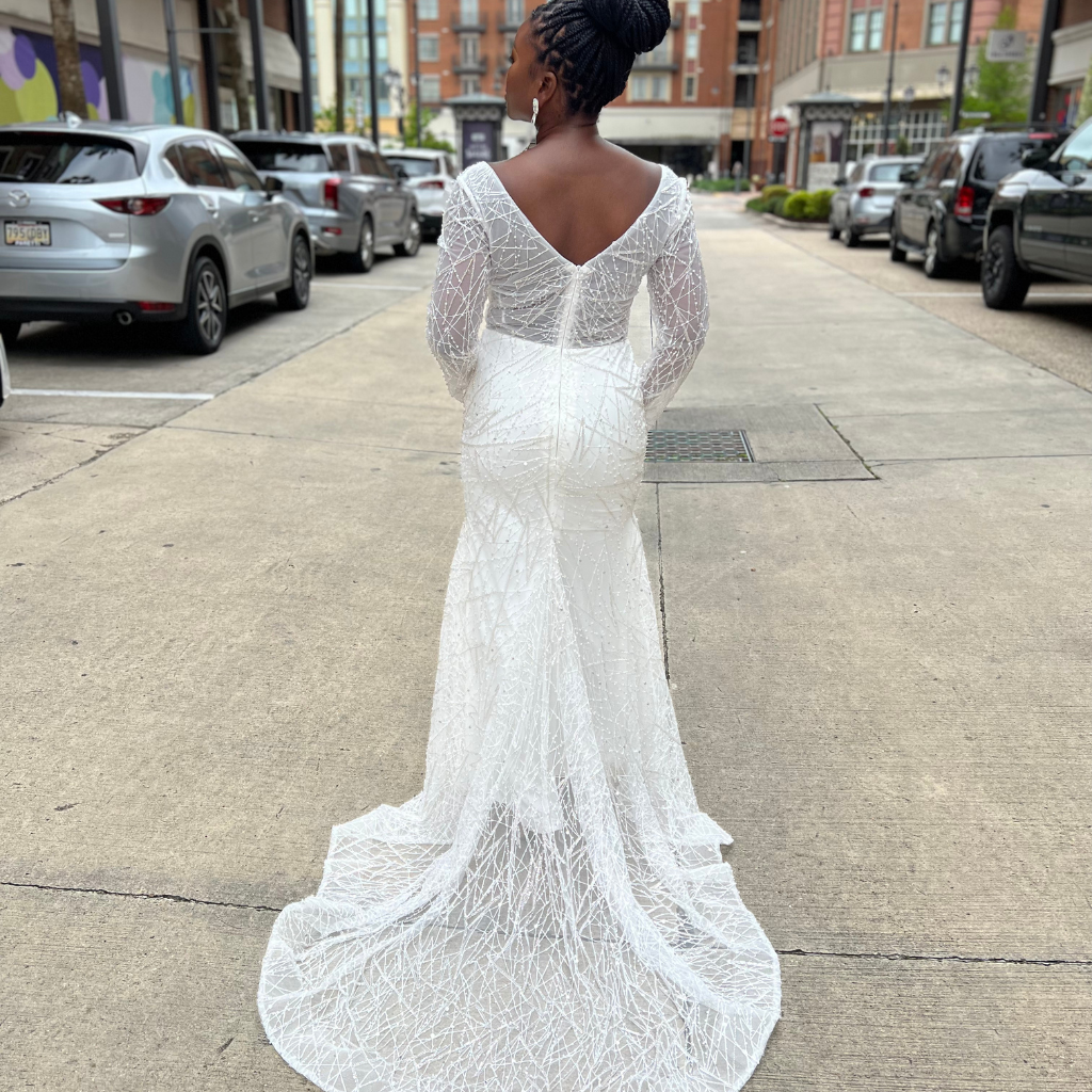 The back of the dress features a v-cut design, which adds a touch of drama and sexiness to the dress. The back is also adorned with intricate silver beading, creating a stunning and unforgettable look from every angle.