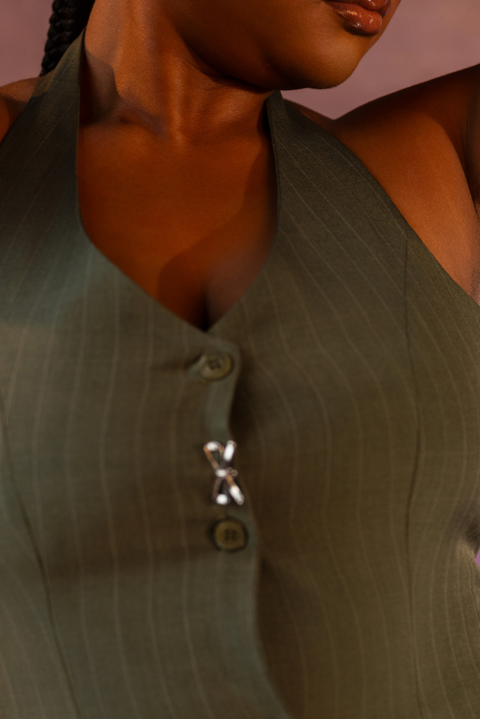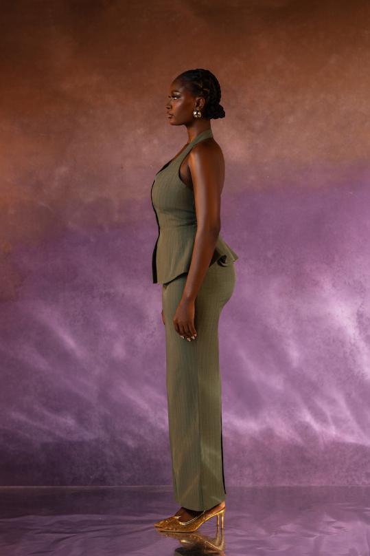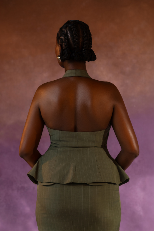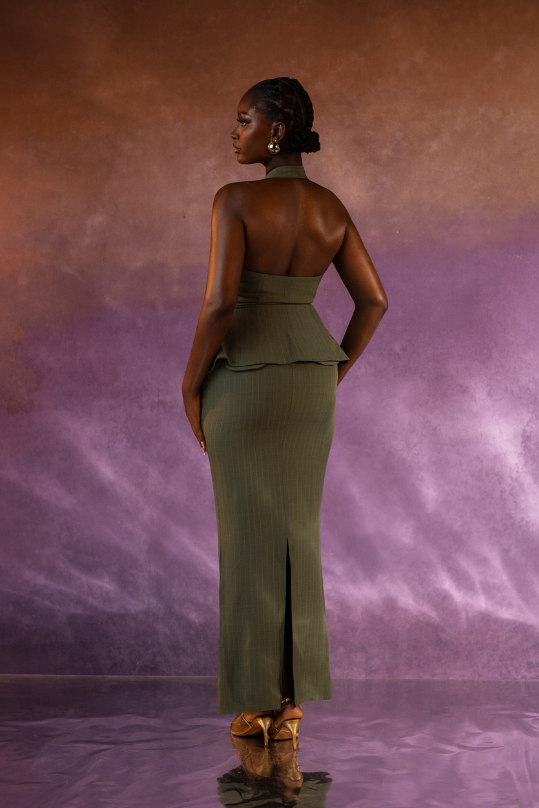 Structured sophistication at its finest. The Verdana Set features a halter-style, button-down top with a tailored peplum waist that flatters and defines the silhouette. Paired with a sleek, ankle-grazing skirt that skims the body in all the right places, this set blends sharp tailoring with feminine ease. Both pieces can be worn together for a refined statement or styled separately for everyday versatility.