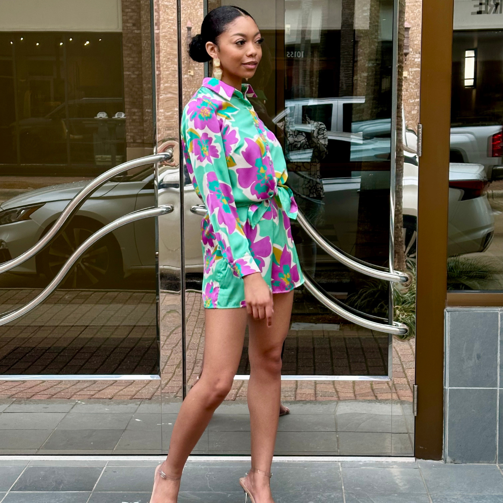 Introducing our enchanting Regal Floral Set, perfect for adding a touch of whimsy to your wardrobe. The long-sleeved top and shorts are adorned with a beautiful floral print, creating a vibrant and eye-catching ensemble. Made from high-quality fabric, this set is as comfortable as it is stylish. Whether you're lounging at home or exploring the outdoors, this charming set is sure to turn heads and make you feel fabulous.
