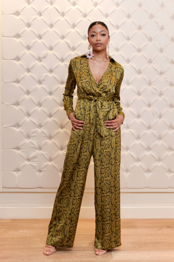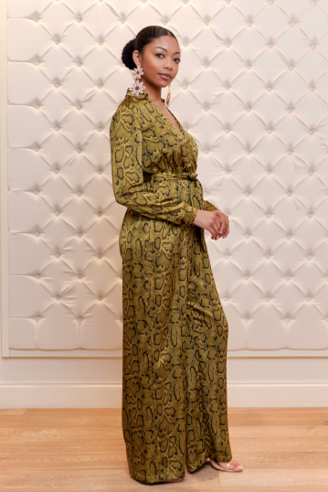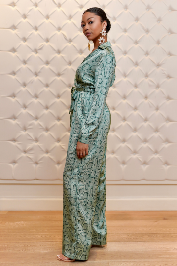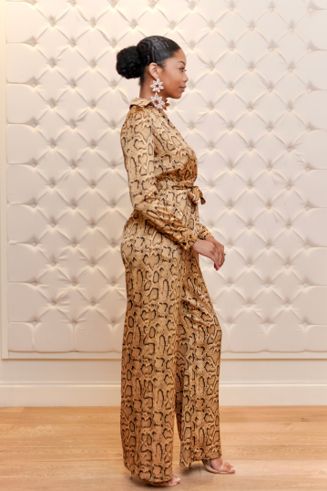 Get in touch with your wild side with this beautiful snake print jumpsuit. This jumpsuit uses a contemporary cut that’s not too tight or too loose. It features a flat collar and long sleeves with cuffs, while the waist has a bow-tie strap on the side. With wide legs, the jumpsuit is a breeze to walk in. Bold but beautiful, it’s the ideal choice for any confident woman.