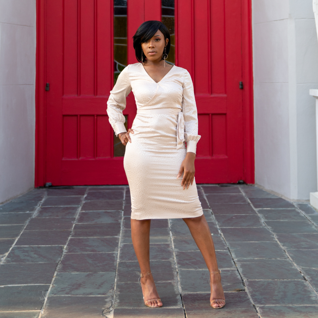 Enhance the glamour and sophistication in your wardrobe with this vintage inspired look. The sleek design and subtle cheetah print embellishes the elegance. This dress features a V neckline with a front wrap and long sleeves with exquisite cuffs. An array of fabric covered buttons flows down the small of the back and takes this look to perfection. From formal dinners to a romantic date night, this dress will surely outshine others.